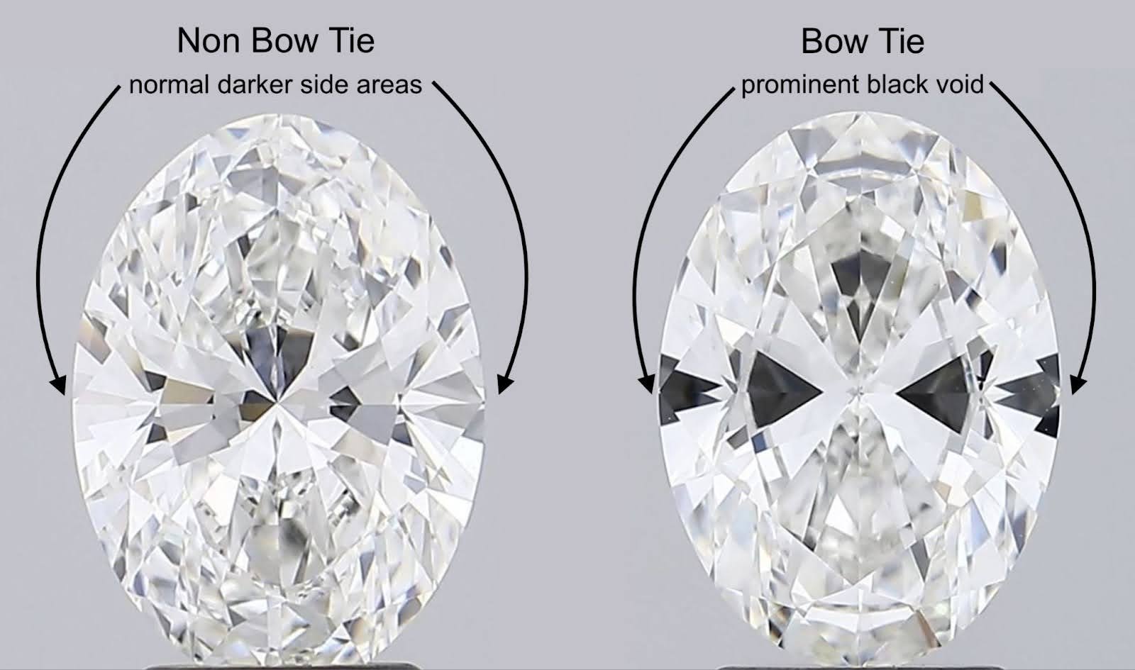Bow ties are most often seen in oval, pear and marquise diamonds. These shapes extend light across a longer outline than round stones, which increases the challenge of even light returning through the centre. The shadow can vary from a minimal darkening to a very distinct bow tie – higher ratio/more elongated stones can be more prone to bow ties.